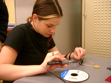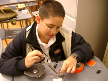 | Amanda solders a piezo transducer (contact mic) to a jack. | ||||||||
