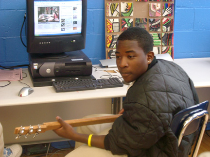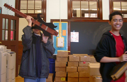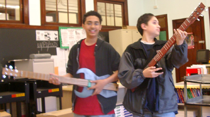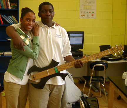 | Kevin helps Rondell add frets to his guitar. | ||||||||